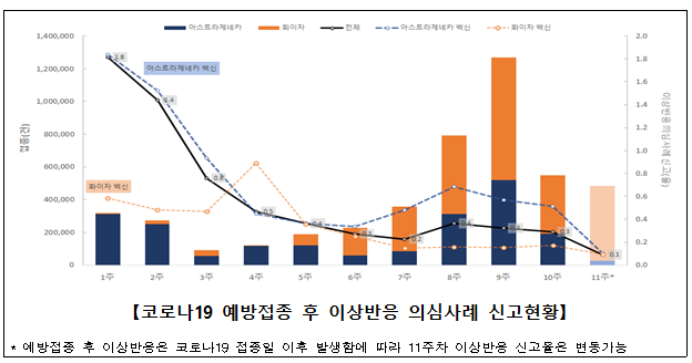 ▲ 코로나19 예방접종대응추진단에 따르면, 16일 0시 기준 전체 예방접종 466만9153건 중 2만2122건(11주차 신규 신고건수 2499건)의 이상반응이 신고됐다. 근육통, 두통 등 일반 이상반응 사례는 2만1202건(95.8%), 사망, 아나필락시스 의심 등 중대한 이상반응은 920건(4.2%)이었다. 그래프는 16일 0시 기준 코로나19 예방접종 후 이상반응 의심사례 신고현황. [출처=코로나19 예방접종대응추진단] |