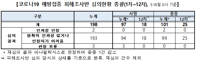 현재까지 진행된 12차례의 예방접종피해조사반 회의에서 198건(사망사례 97건과 중증사례 101건)을 심의했고, 이 중 2건만 백신접종 간 인과성이 인정됐다.