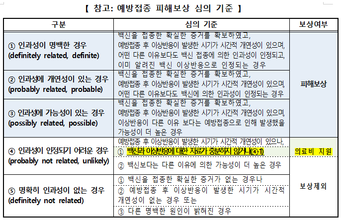 예방접종 피해보상 심의기준을 보면, ‘인과성이 명백한 경우’(definitely related, definite)와 ‘인과성에 개연성이 있는 경우’(probably related, probable), ‘인과성에 가능성이 있는 경우’(possibly related, possible) 등 세 가지에 해당할 때는 ‘피해보상’을 한다.