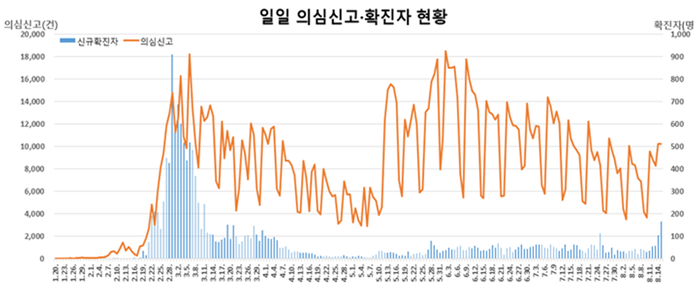 ▲ 코로나19 국내 전체 일일 의심신고·확진자 현황. [출처= 중앙방역대책본부]