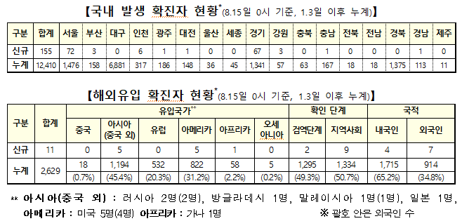 ▲ 15일 0시 기준 국내발생 및 해외유입 확진자 현황. [출처= 중앙방역대책본부]