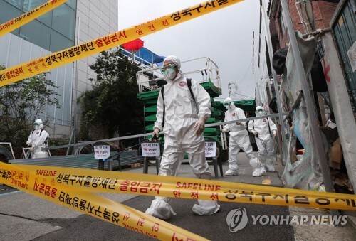 ▲ 14일 오후 신종 코로나바이러스 감염증(코로나19) 집단발병이 발생한 서울 성북구 사랑제일교회 입구에서 관계자들이 방역 작업을 마치고 밖으로 나서고 있다. 서울시는 이날 성북구 사랑제일교회에 대해 시설 폐쇄 조치를 내렸다. [서울= 연합뉴스]