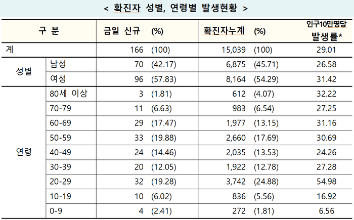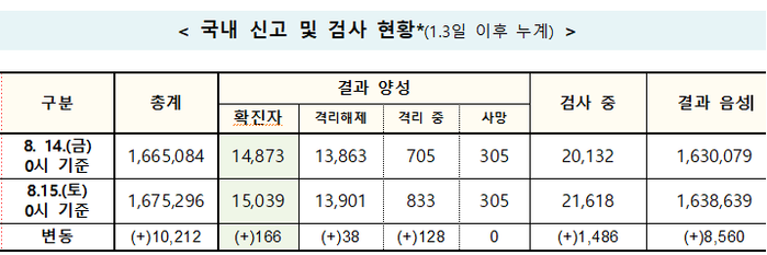 중앙방역대책본부(방대본)는 15일 0시 기준으로 전날 대비 코로나19 신규 확진자가 166명이나 추가 확인되어 누적 확진자수는 총 1만5039명으로 집계됐다고 밝혔다.