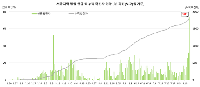 ▲ 코로나19 서울지역 일일 신규 및 누적 확진자 현황. [출처= 중앙방역대책본부]