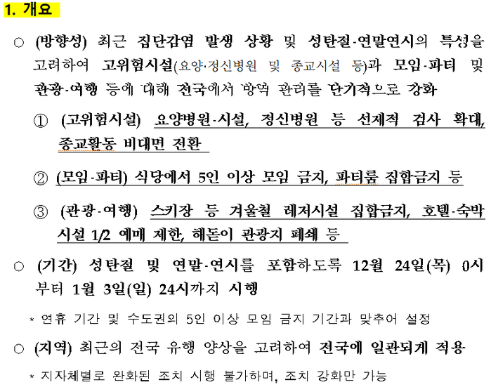 ▲ 연말연시 특별방역 강화대책 개요. [출처= 중앙재난안전대책본부] |