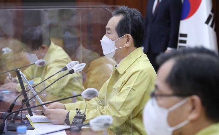 ▲ 정세균 국무총리가 22일 오전 정부서울청사에서 열린 신종 코로나바이러스 감염증(코로나19) 대응 중앙재난안전대책본부(중대본) 회의에서 발언하고 있다. [사진= 연합뉴스] |