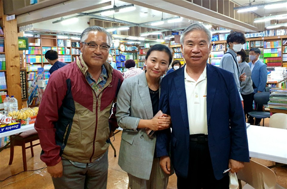 ▲ 김동춘 문화재지킴이지도사(왼쪽) 박정인 해인예술법연구소장(가운데) 임충섭 문화재지킴이지도사(오른쪽)가 지난 6월 송파문고 특강이 끝난 후 포즈를 취하고 있다. |