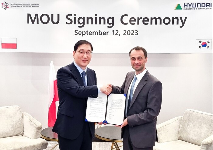 ▲ 지난 12일(현지시간) 폴란드 수도 바르샤바에서 현대건설 윤영준 사장(사진 왼쪽)과 폴란드원자력연구원 마신 카다스 부원장(오른쪽)이 '원전 연구개발(R&D) 및 연구용 원자로 협력에 대한 업무협약'을 체결한 후 기념사진을 촬영하고 있다. [사진=현대건설] |
