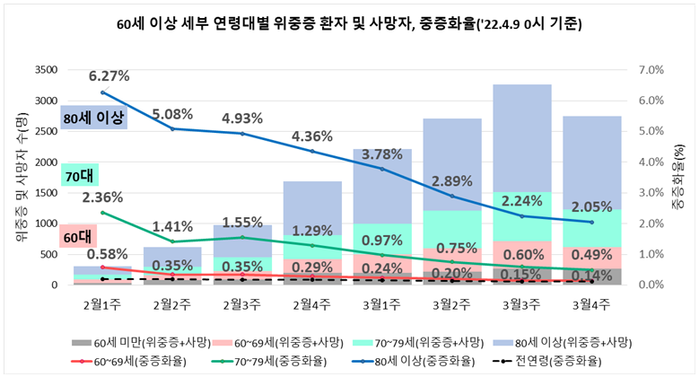 ▲ 9일 0시 기준 60세 이상 세부 연령대별 위중증 환자 및 사망자, 중증화율. [질병관리청 제공]