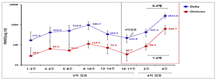 3차접종 후 4개월 대비 4차접종 2주 후는 항체가가 2~2.5배 증가했으며, 4차접종 2주 후 대비 4주 후는 6.4~7.4배 증가한 것이 확인됐다.