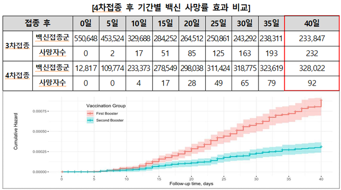 ▲ 이스라엘에서의 3차접종과 4차접종 후 사망률 비교 연구에서, 60세 이상 연령층에서 3차접종 완료군과 비교한 결과 4차접종 완료군에서 사망률이 감소했다. [질병관리청 제공]