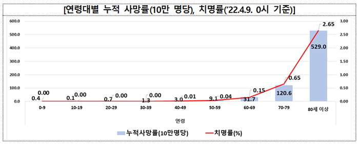 ▲ 9일 0시 기준 연령대별 10만명당 누적 사망률과 치명률. [질병관리청 제공]