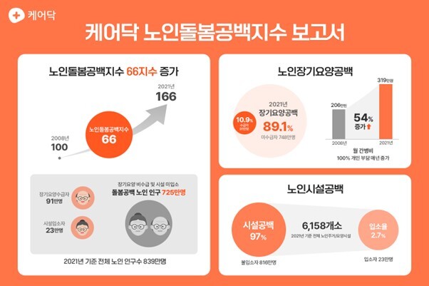 케어닥 박재병 대표는 "노인 인구의 폭발적인 증가 대비 돌봄 공백의 부담이 점점 늘어나고 있는 국내 현황을 많은 이들에게 구체적으로 보여줄 수 있도록 '노인돌봄공백지수'를 고안해 선보이게 됐다"며 "노인 돌봄 공백의 장벽을 더욱 건강하게 넘어서기 위해서는 장기요양등급 수가 제도의 개편 및 적절한 인프라의 확충, 나아가 민간주도형 시니어 주거복지 제도 지원, 요양서비스 민간화 확대 등 민관의 보다 적극적인 협력이 필요하다"라고 설명했다.