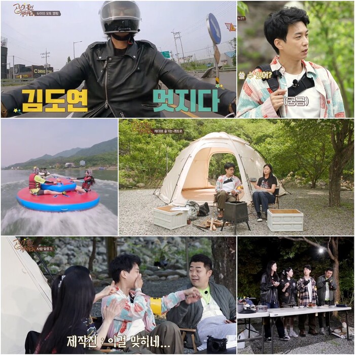 그런가 하면, ‘고삐캠 4인방’은 김밥과 삶은 달걀로 레트로풍 아침 식사를 시작한다. 최준혜는 준비된 콜라를 보자마자 “이거 까나리 아니죠?”라며 의심을 거두지 못한다. 식사를 마친 김기욱과 최준혜는 수상 레저를 즐기기 위해 북한강으로 떠나고, 김원준과 듀이는 감성 캠핑을 위한 대형(?) 텐트치기에 돌입한다. 특히 텐트를 완성한 듀이와 김원준은 ‘불멍’을 하며, 90년대 레트로 감성에 푹 빠진다. 얼마 뒤, 다시 한 자리에 모인 ‘고삐캠 4인방’은 몸보신을 위한 오리백숙 먹방도 선보인다.