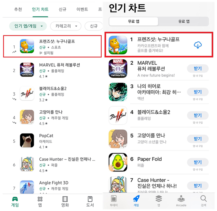 | ▲ 구글플레이(좌), 애플앱스토어(우)에서 모두 인기 순위 1위를 차지한 '프렌즈샷: 누구나골프' [카카오프렌즈 제공] |