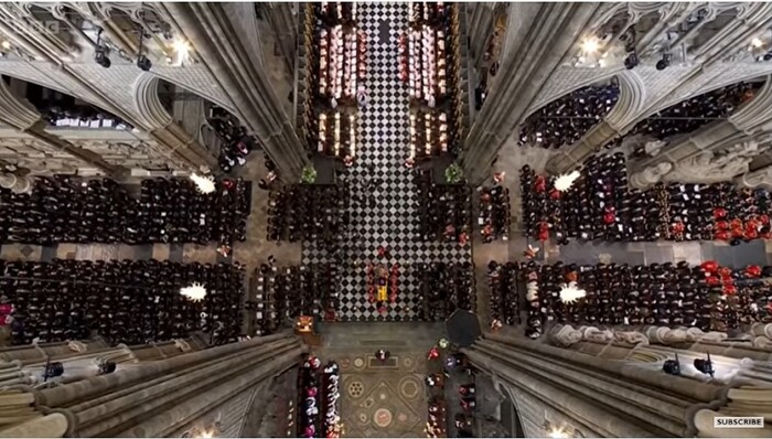 | ▲ 엘리자베스 2세 영국 여왕의 장례식이 거행되는 19일(현지시간) 웨스트민스터 사원 내부 전경. 여왕의 시신을 담은 관이 막 운구를 마쳤다. [BBC 유튜브 영상 캡처] |