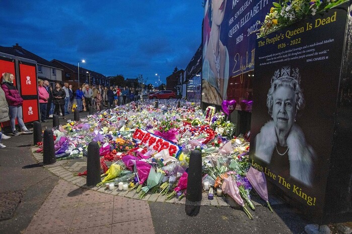 | ▲ 고(故) 엘리자베스 2세 영국 여왕의 국장을 하루 앞둔 18일(현지시간) 영국령인 북아일랜드의 수도 벨파스트 거리에 여왕을 추모하는 꽃다발이 수북이 쌓여 있고 시민들이 여왕에게 경의를 표하며 묵념하고 있다. [벨파스트 AFP=연합뉴스] |