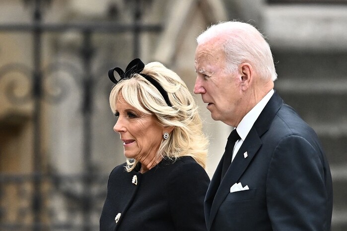 | ▲ 엘리자베스 2세 영국 여왕의 장례식이 열린 19일(현지시간) 조 바이든 미국 대통령(오른쪽)과 질 바이든 여사가 장례식이 거행되는 런던 웨스트민스터 사원에 도착하고 있다. [런던 AFP=연합뉴스] |
