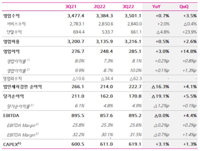 같은 기간 매출은 전년 동기보다 0.7% 증가한 3조 5011억 원, 매출에서 단말 수익을 제외한 서비스수익은 2.0% 늘어 2조 8400억 원을 기록했다.