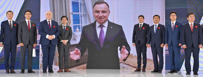 | ▲ 7일(현지시간) 폴란드 스탈로바볼라시 E-모빌리티 산업단지에서 열린 SK넥실리스 동박 공장 착공식에서 박원철 SKC 사장(왼쪽 두번째) 등 주요 참석자들이 안제이 두다 폴란드 대통령의 영상 메시지를 보고 있다. [SKC 제공] |
