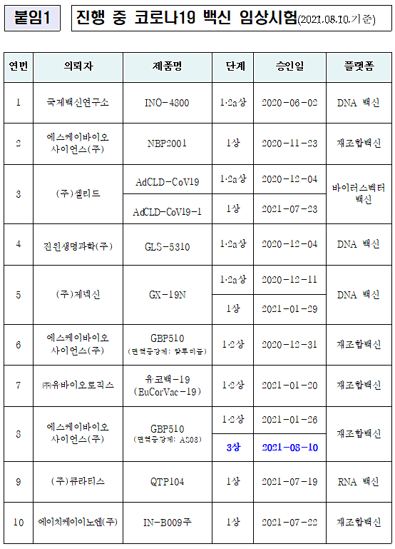 ▲ 진행 중인 코로나19 백신 임상시험. [출처=식품의약품안전처] |