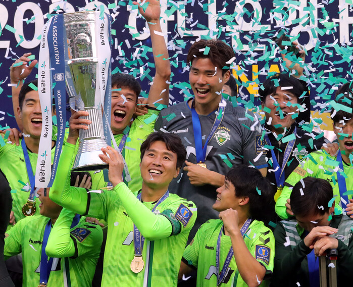 ▲ 8일 오후 전북 전주월드컵경기장에서 열린 2020 하나은행 FA컵에서 우승한 전북 현대 선수들이 우승컵을 들고 기뻐하고 있다. [전주= 연합뉴스] |