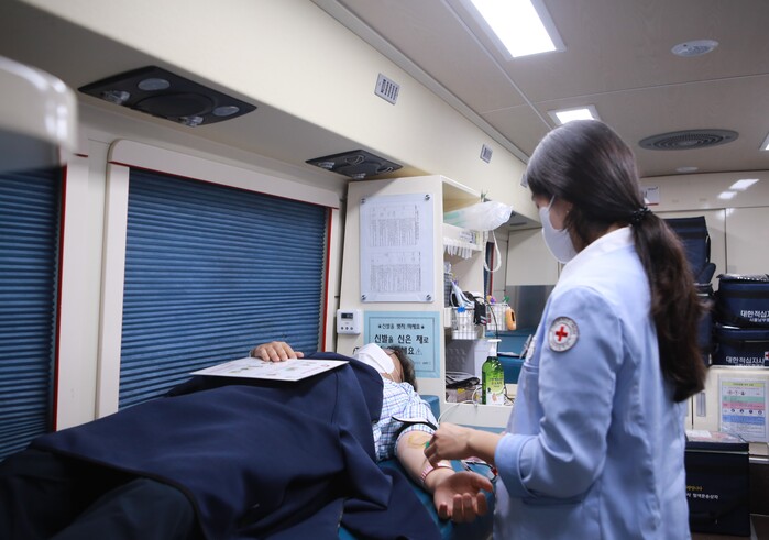 | ▲ 금호석유화학 직원이 헌혈 버스에서 헌혈에 동참하고 있다. [사진=금호석유화학 제공] |