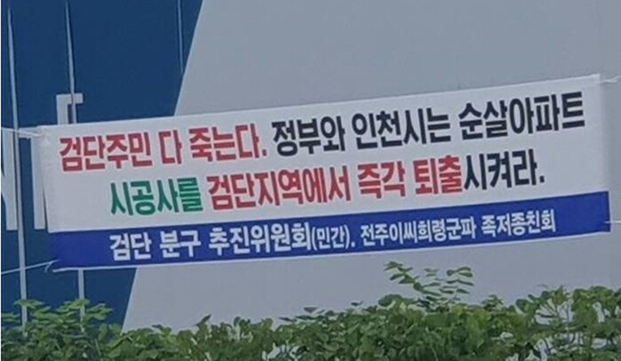 GS건설이 시공하는 중 지하주차장 붕괴사고가 난 인천 검단신도시 내 아파트에는 "검단 주민 다 죽는다. 정부와 인천시는 순살아파트 시공사를 검단지역에서 퇴출시켜라"라는 현수막도 걸렸다.