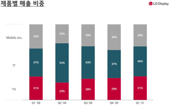 제품별 매출에서 IT제품용 패널의 비중이 전체 40%를 차지해 가장 높은 실적을 거뒀다. 뒤를 이어 TV 패널이 31%였고 모바일용 패널은 29%를 기록했다.
