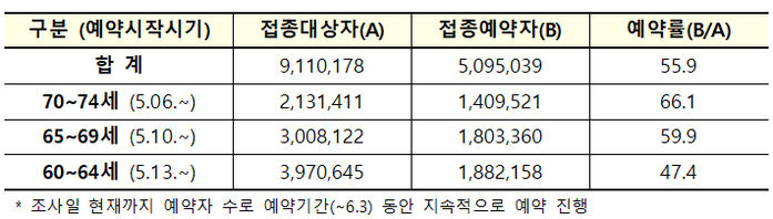 23일까지 60세 이상 74세 어르신 사전예약률은 약 56%를 보였다. 사전예약이 6월 3일까지 계속되므로 예약률은 지속적으로 상승할 것으로 보인다.60세 이상 어르신 등을 위한 아스트라제네카 백신 접종물량은 예약자 수를 기준으로 예방접종기관에 순차적으로 배송될 예정이며, 오는 27∼31일 접종하게 될 분량인 142만 회분은 지난 20일부터 이미 배송 중에 있다.