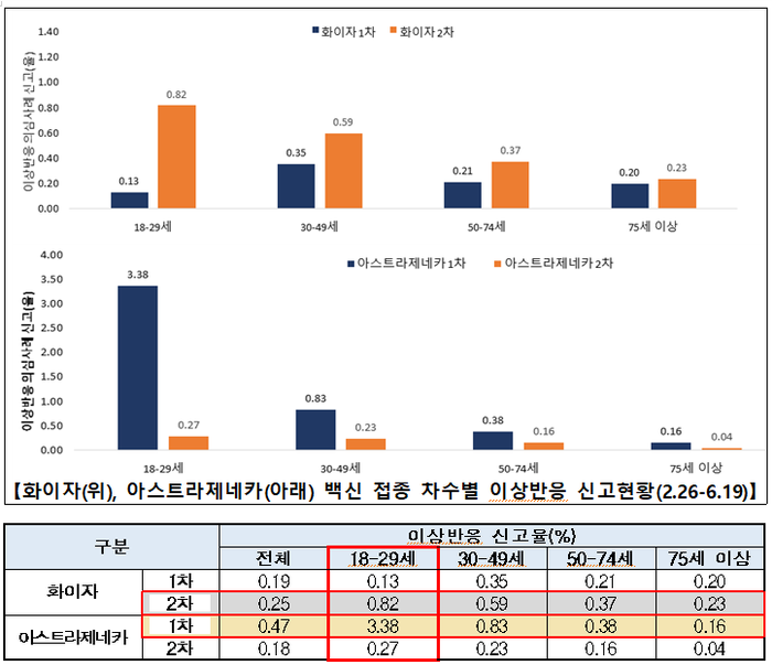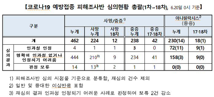 한편, 그간 18차례에 걸친 예방접종피해조사반 회의를 통해 사망 및 중증 사례 462건(사망 224건, 중증 238건)과 아나필락시스 의심사례 230건을 심의한 결과, 현재까지 혈소판 감소성 혈전증 첫 사례인 30대 남성 사망 1건을 비롯, 중증 사례 3건, 아나필락시스 72건 등 총 76건에 대한 인과성만이 인정됐다.