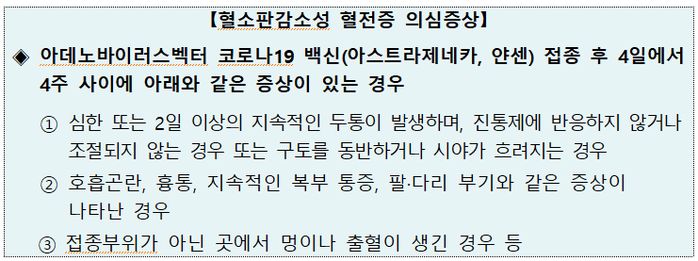 ▲ 혈소판감소성 혈전증 의심증상. [출처=질병관리청] |