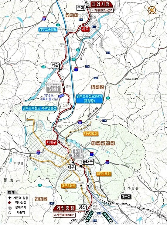 | ▲ 구미~경산 간 대구권 광역철도 노선도. [국토교통부 제공] |