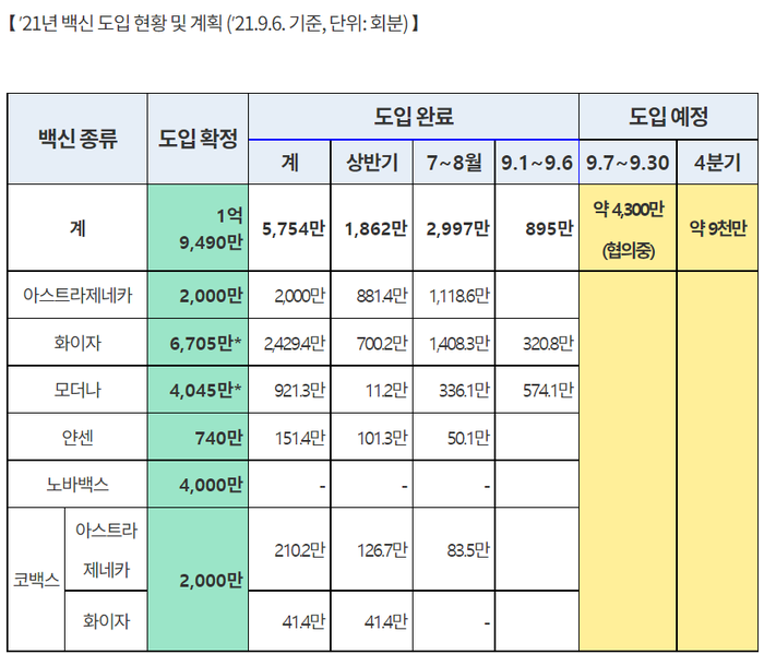 ▲ 6일 기준 2021년 코로나19 백신 도입 현황 및 계획. [출처=보건복지부] |