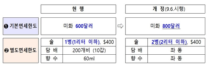 술의 수량과 한도는 1병·1리터에서 2병·2리터로 높였다. 가액 기준은 400달러 이하 그대로다.