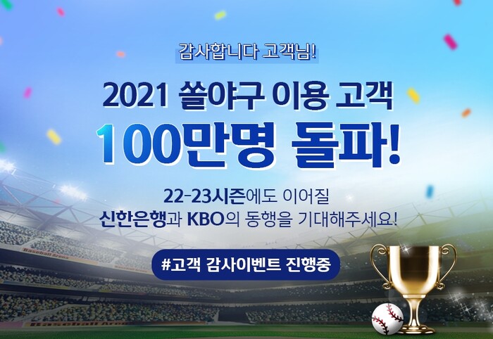 신한은행은 ‘쏠야구’ 연간 이용 고객 100만명 달성을 기념해 ‘쏠야구 100만 감사제 이벤트’를 19일까지 진행한다. 신한 쏠(SOL)에서 ‘쏠야구’를 접속해 이벤트 참여만 하면 추첨을 통해 ▲2021 올스타 · 라이징스타 친필 싸인 유니폼(10명) ▲치킨 상품권(100명) ▲모바일 커피쿠폰(1000명)을 제공한다.