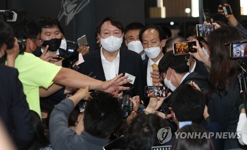 ▲ 윤석열 전 검찰총장이 지난 9일 오후 서울 중구 남산예장공원 내에 있는 우당 기념관 개관식에 참석해 전시물을 관람한 뒤 취재진에 둘러싸여 있다. [사진=연합뉴스] |
