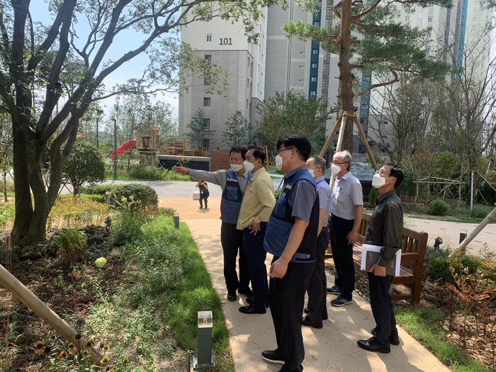 ▲ 정장선 평택시장이 더샵 지제역 센트럴파크 아파트 단지를 방문해 단지내 조경시설을 둘러보고 있다. [사진= 포스코건설] |