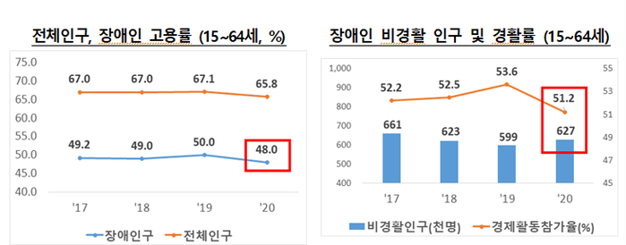 | ▲ 연도별 전체인구와 장애인 고용률, 장애인 비경제활동 인구 및 경제활동인구비율. [출처=고용노동부] |