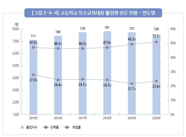 | ▲ 연도별 고등학교 특수교육대상 졸업생 진로 현황. [출처= 교육부 '특수교육연차보고서'] |