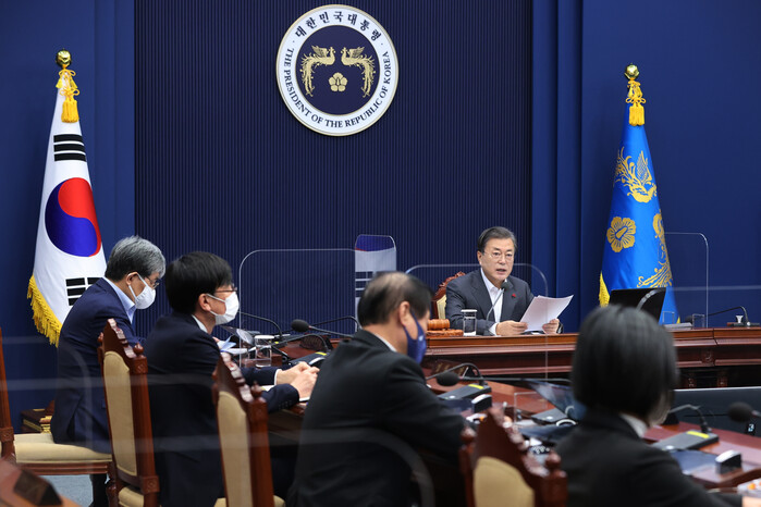 ▲ 문재인 대통령이 15일 오전 청와대에서 영상 국무회의를 주재하고 있다. [사진= 연합뉴스] |
