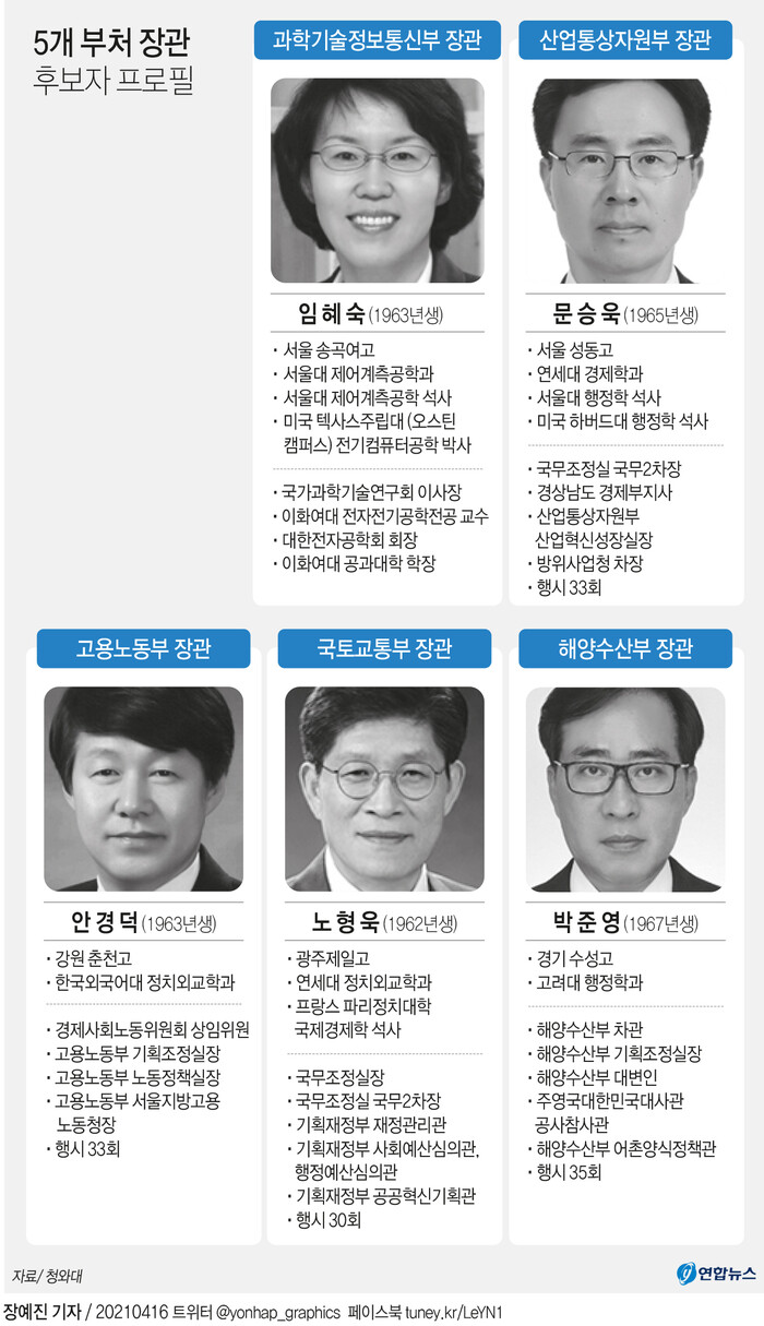 ▲ 5개 부처 장관 후보자 프로필. [그래픽= 연합뉴스] |