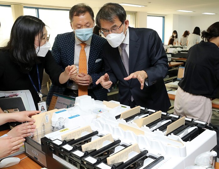 ▲ 노태악 중앙선거관리위원장(오른쪽)이 6.1 지방선거를 보름 앞둔 17일 오후 서울 송파구선거관리위원회를 방문해 개표에 참여할 자동 투표용지 분류기 교육을 참관한 뒤 개표기를 살펴보고 있다. [공동 취재=연합뉴스] |