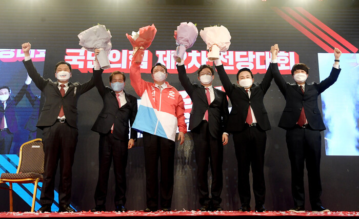 ▲ 국민의힘 윤석열 대선후보(왼쪽 세번째)가 이준석 대표 및 경선후보들과 꽃다발을 들고 기념촬영을 하고 있다. 왼쪽부터 김기현 원내대표, 홍준표 경선후보, 윤 후보, 유승민, 원희룡 경선후보, 이준석 대표. [국회사진기자단=연합뉴스] |