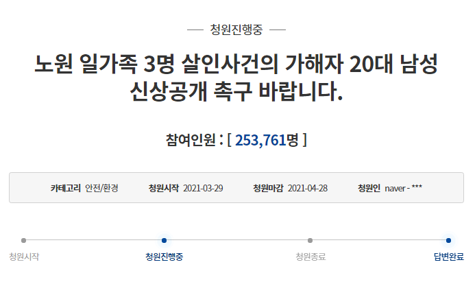 '노원 일가족 3명 살인사건의 가해자 20대 남성 신상공개 촉구 바랍니다'라는 제목으로 지난달 29일 올라온 국민청원에는 이날 오후 6시20분 현재 25만3761명이 참여했다.