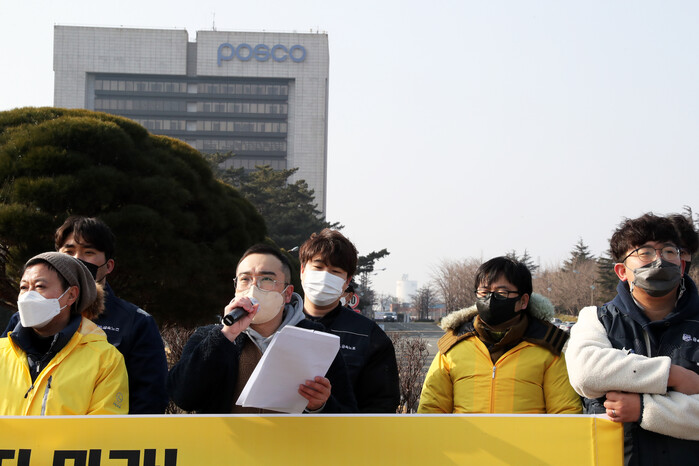 | ▲ 26일 경북 포항 포스코 본사 앞에서 정의당과 금속노조 포항지부 관계자 약 20명이 최근 발생한 산재사망사고와 관련해 포스코를 규탄하는 기자회견을 하고 있다. [사진=연합뉴스] |