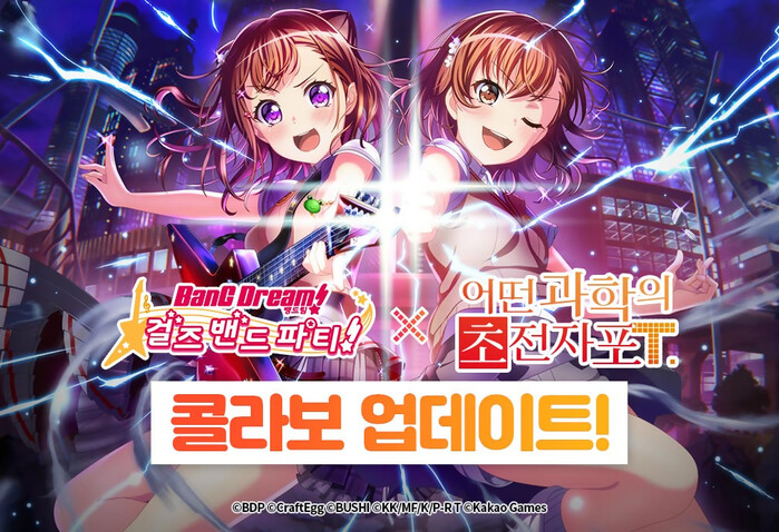 카카오게임즈(대표 남궁훈, 조계현)가 서비스하고 크래프트에그(대표 모리카와 슈이치)와 부시로드(대표 하시모토 요시타카)가 공동 제작한 인기 모바일 리듬게임 ‘뱅드림! 걸즈 밴드 파티!’에서 ‘어떤 과학의 초전자포 T’ 컬래버레이션 이벤트를 개최한다고 20일 밝혔다.