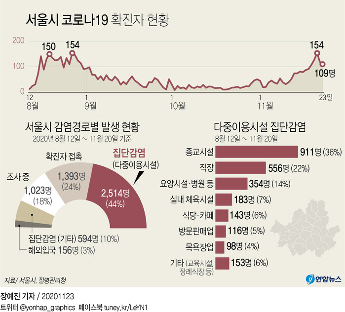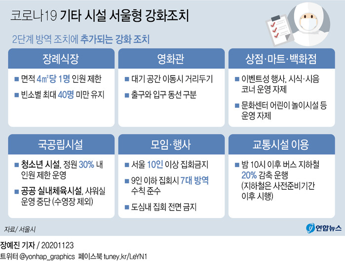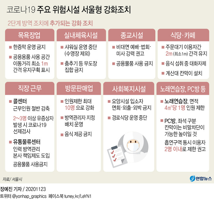 ▲ 서울시는 24일부터 연말까지를 '1천만 시민 긴급 멈춤 기간'으로 선포하고, 정부의 수도권 사회적 거리두기 2단계 격상 조치와 함께 관내 10대 시설에 대한 '서울형 정밀 방역'을 시행한다고 밝혔다. [그래픽= 연합뉴스] |