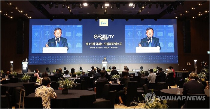 | ▲9일 제주 서귀포시 안덕면 신화월드에서 열린 '제12회 국제e-모빌리티엑스포'에서 김대환 엑스포조직위원장이 연설하고 있다. [사진=연합뉴스] |