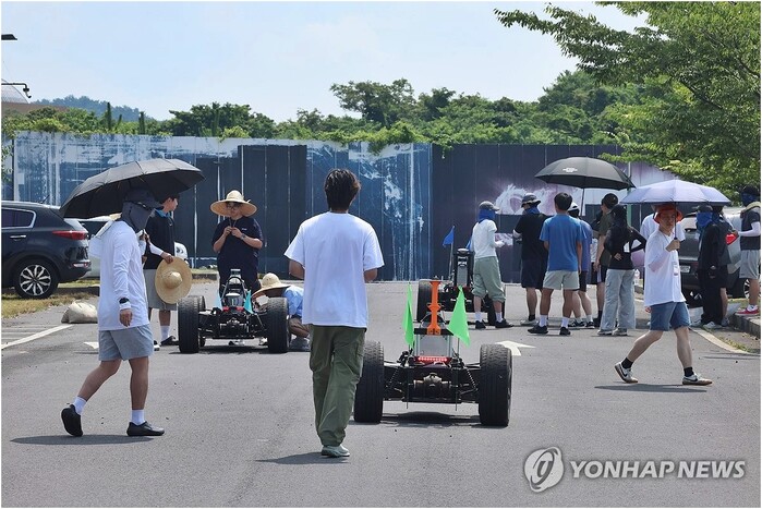 | ▲9일 제주 서귀포시 안덕면 신화월드에서 열린 '제12회 국제e-모빌리티엑스포'의 부대행사로 열리는 '제4회 국제 대학생 EV 자율주행 경진대회'에 참가한 학생들이 출전 준비를 하고 있다. [사진=연합뉴스] |
